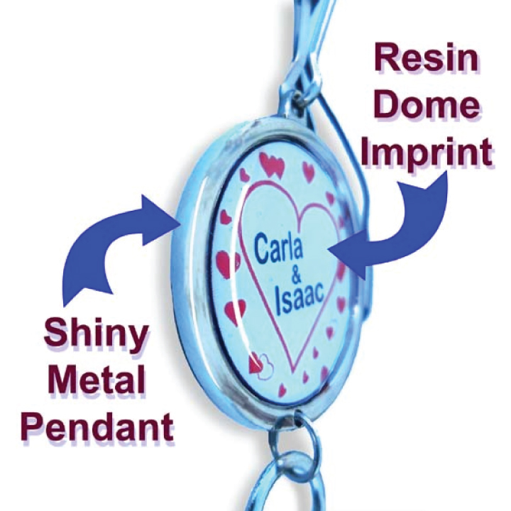 Custom bling lanyards with a custom pendant. Full color resin dome imprint on a hanging medal medallion. Comes standard with trigger hook and cell phone loop.