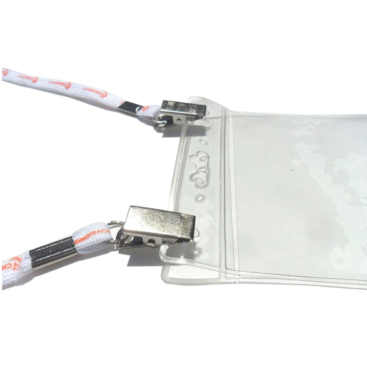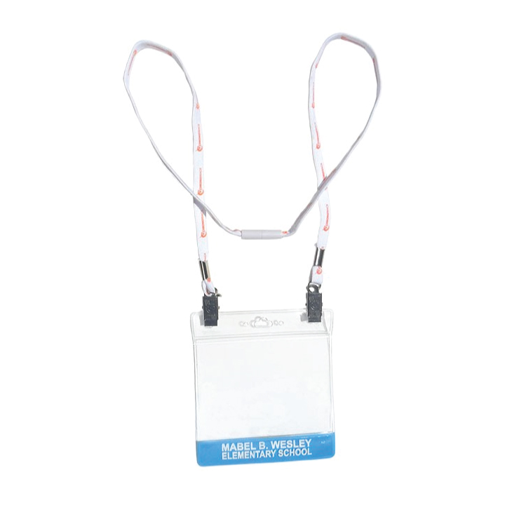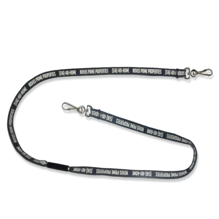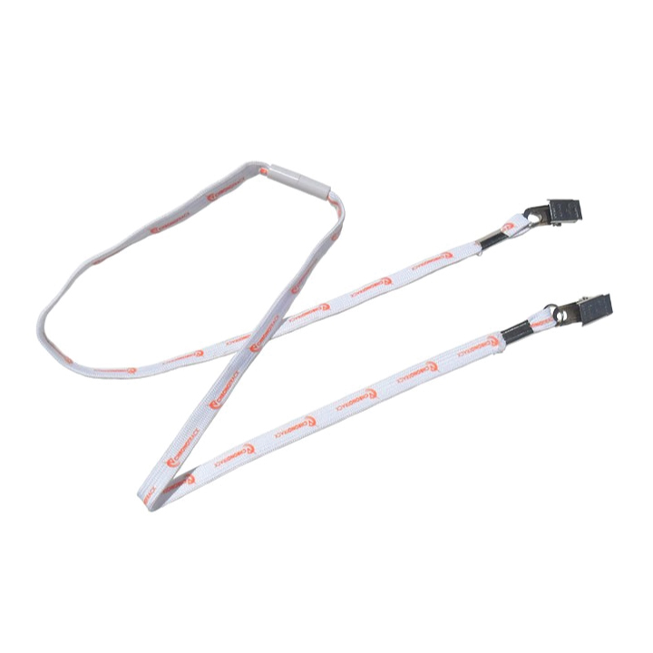 Custom printed double ended lanyard… Also known as “open-ended lanyards”. These have an attachment on each end of the strap material (some call them “double-clip lanyards”). This allows it to hold an ID holder with two holes on the corners. Available in a broad range of material colors and attachments.