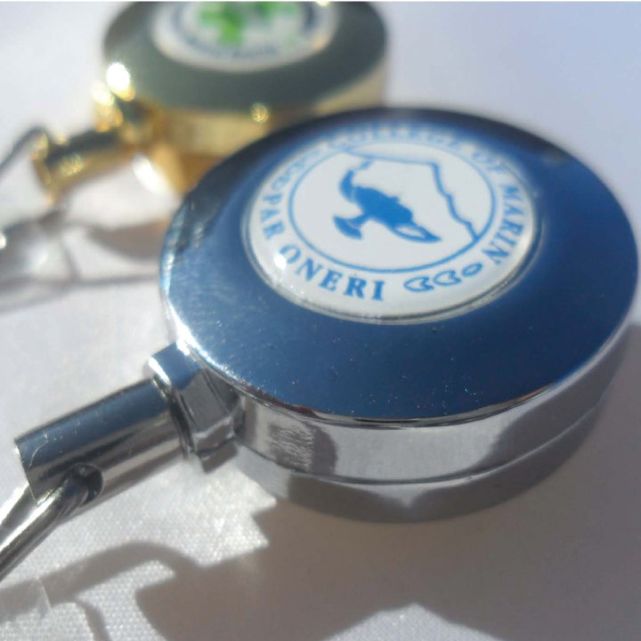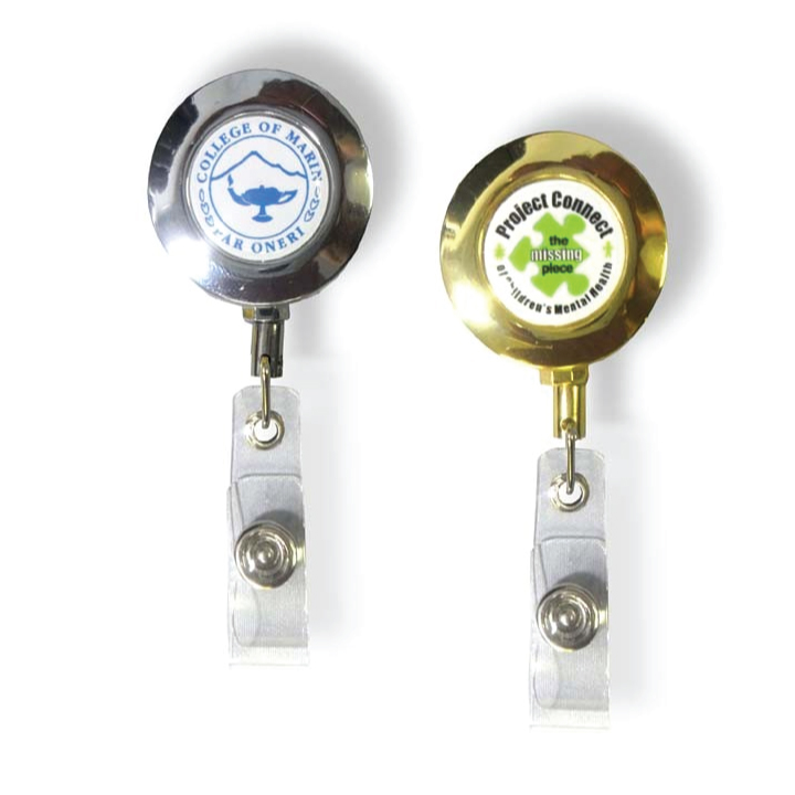 These custom printed metal badge reels are heavy duty professional quality. Choice of metallic silver badge reels or the hard-to-find metallic gold badge reels. Price includes full color custom printed with epoxy resin dome imprint.