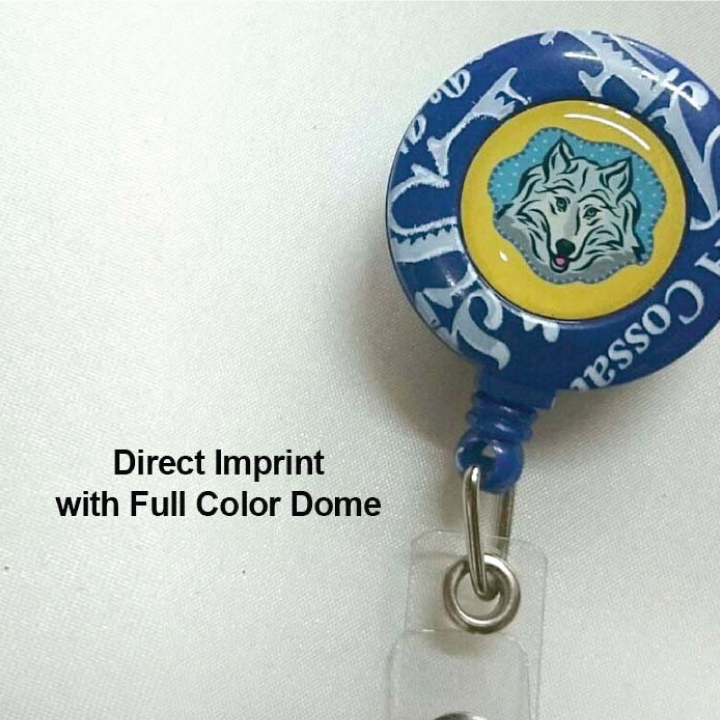 Custom round, retractable badge reels can be customized either with a one-color direct imprint or with a full color, permanent dome sticker. Rush service offered (PLEASE CALL FOR AVAILABILITY)! Guaranteed lowest discounted prices in the industry on retractable badge holder reels in large or small quantities.