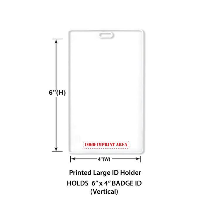 Large vertical badge holder custom printed. Made out of a clear plastic material, this custom id holder holds a 6″ x 4″ insert. 6×4 vertical ID holder.