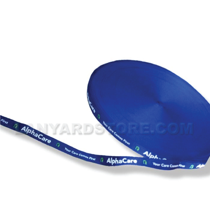 Want to make your own lanyards? We have full strap printing facilities and can just print you a spool of strapping which you can cut as you need. 3/8″ wide polyester strap material. Printed lanyard material spool. Strap material for making lanyards, custom printed with your logo or text. 400 ft spool makes approximately 140 lanyards. Can also be used to make belts, handbag handles, shoelaces, collars, etc.