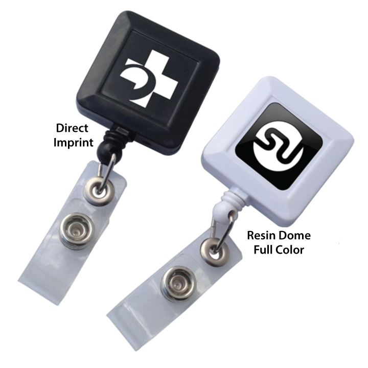 Custom printed square badge reels in large or small quantities. These badge holders can be customized with either a direct imprint or full-color epoxy resing dome. The 26 inch cord has a vinyl snap holder,
